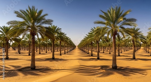 Date Palm Tree Plantation in Desert Oasis under Clear Blue Sky.