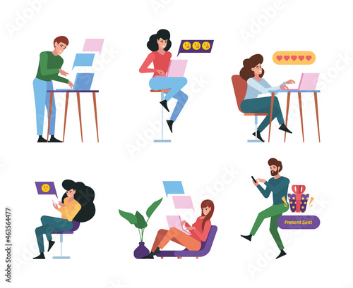 Dating online people. Couples chatting in web messagers male and female characters online talking loving activities garish vector dating internet sites