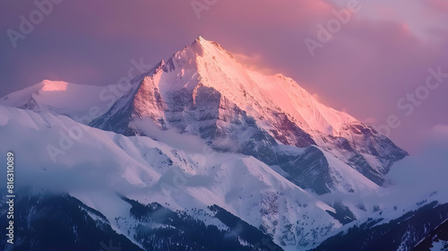 Dawn over the snow capped mountains Snowy mountain peak at dawn Sunrise in mountains Mountain sunrise landscape : Generative AI