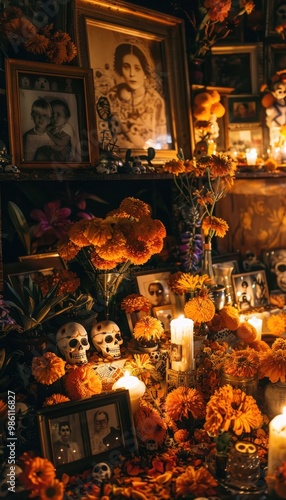 Day of the Dead Altar with Marigolds, Sugar Skulls, and Candles - Dia de los Muertos Celebration