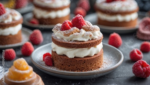 Decadent layered chocolate cake topped with fresh raspberries and cream against a moody backdrop of assorted desserts.