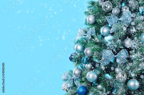 Decorated Christmas tree branch against blue background