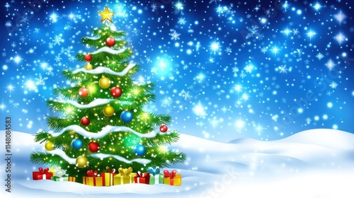 Decorated Christmas tree in snowy landscape.