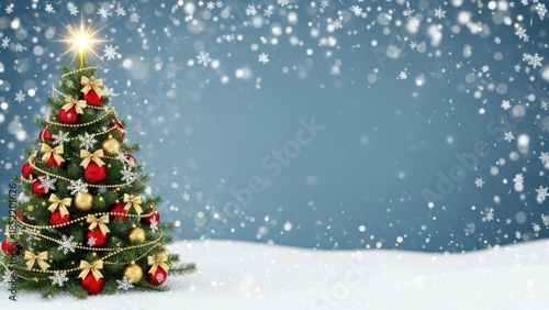 Decorated christmas tree with festive ornaments and snowfall