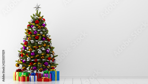 decorated christmas tree with gift boxes in white room