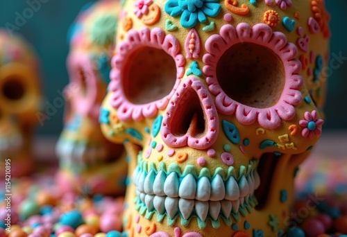 Decorated sugar skull with vibrant colors and intricate details.
