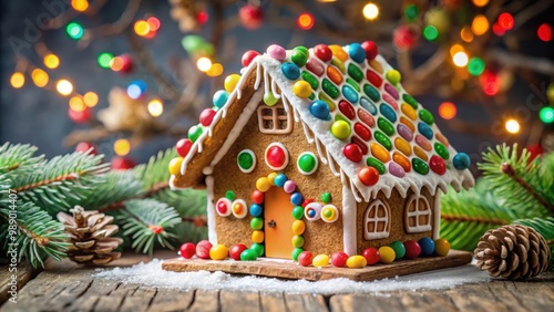 Decorating a festive gingerbread house with colorful candies and frosting for Christmas