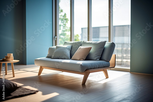 Decoration for living room mix of italian and roman, Large blank frame on wall, White and ivory colors, sunlight ray from window,