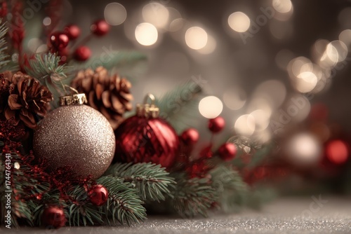 Decorative arrangement of Christmas ornaments and pine cones with blurred lights in the background for festive celebrations