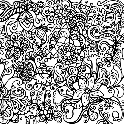 Decorative hand drawn floral black and white background. Vector Illustration.