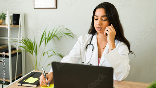 Dedicated healthcare professional multitasks in her office, talking on the phone and jotting down notes