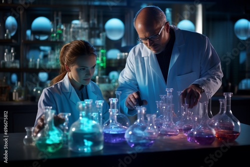 Dedicated scientists in a bustling medical research laboratory,