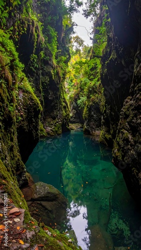 Deep, emerald pool nestled in a verdant canyon