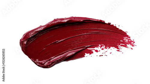 Deep red lipstick smear, rich creamy texture with high-gloss finish, luxurious and highly pigmented cosmetic stroke, isolated on a white background