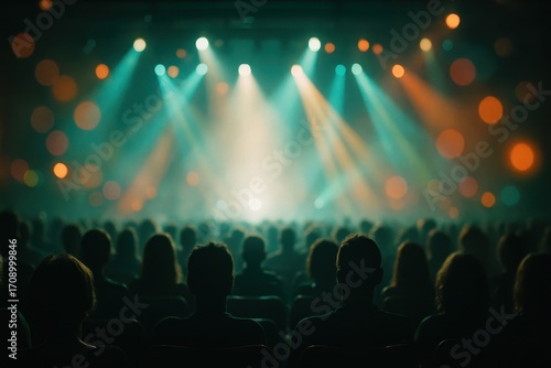 Defocused crowd in concert hall audience silhouettes watching bright stage lights with cinematic atmosphere moody haze and dramatic bokeh for live performance vibes