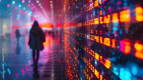 Defocused Digital Art Installation with Glowing Binary Matrix and Cityscape Lights