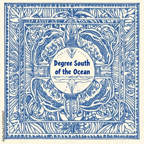 Degree South of the Ocean Nautical Drawing With Marine Life and Geometric Border Design