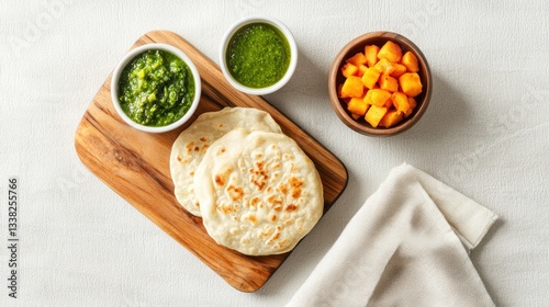 Delectable flatbread with vibrant green chutney and roasted sweet potatoes on wooden board still life