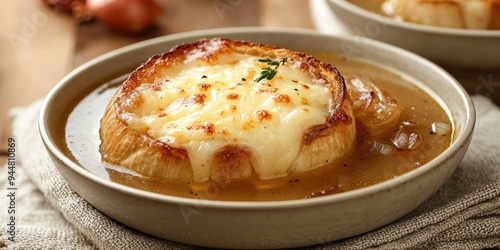 Delectable French Onion Soup with Caramelized Onions, Melted Cheese, and Crusty Bread, Served in a Rustic Bowl for Comfort and Flavor
