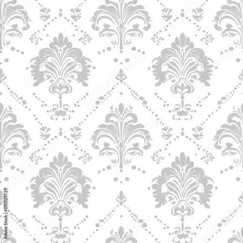 delicate baroque pattern, light gray ornamental diamonds, dotted diagonal lines, white background, symmetrical floral motifs, elegant scrollwork, refined geometric layout, seamless repeat design,
