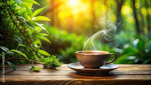 Delicate ceramic cup filled with steaming hot tea, surrounded by lush greenery and subtle morning light, evoking a sense of serenity and peacefulness.