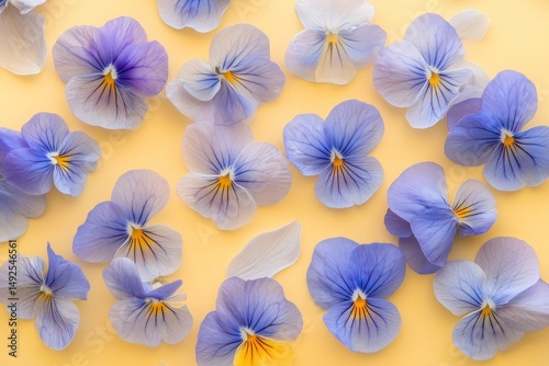 Delicate, light purple pansies scattered on a pale yellow surface.