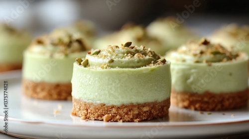 Delicate mini cheesecakes on a white plate. Pistachio-topped green cheesecake steals the show! Soft focus highlights the sweet treat