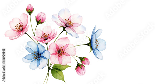 Delicate pink and blue cherry blossom flowers with buds isolated on transparent background
