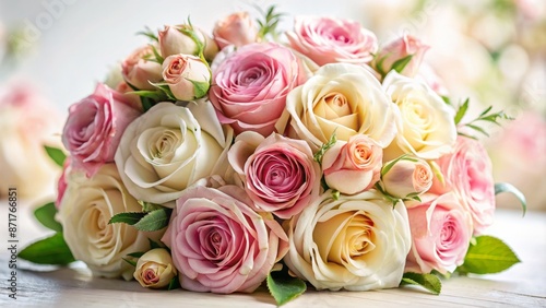 Delicate pink and cream roses arranged in a lush, romantic, and intricately designed bouquet set against a soft white background.