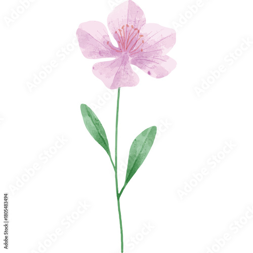 Delicate pink cherry blossom flower with green stem and leaves on transparent background isolated watercolor painting