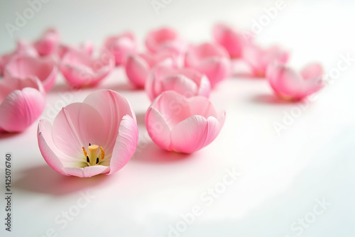 Delicate Pink Tulip Petals Gently Scattered on a Clean White Surface, Creating a Soft and Elegant Floral Arrangement with a Focus on Natural Light