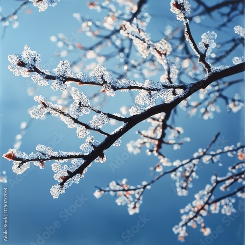 Delicate powdered branches glisten under sunlight in closeup view nature photography winter environment