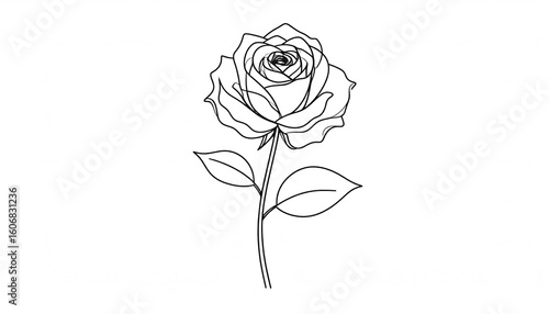 Delicate Rose Outline: Elegant Floral Design with Two Leaves on White Background