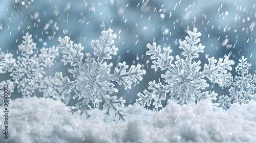 Delicate Snowflakes Glistening on a Winter Landscape Under Soft Blue Hues and Falling Snow