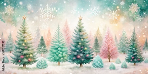 Delicate Watercolor Christmas Trees with Snowflakes on Soft Pastel Background for Minimal Holiday Pattern Design