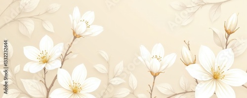 Delicate white floral pattern on beige Elegant leaves & blossoms, seamless repeat , surface, calm