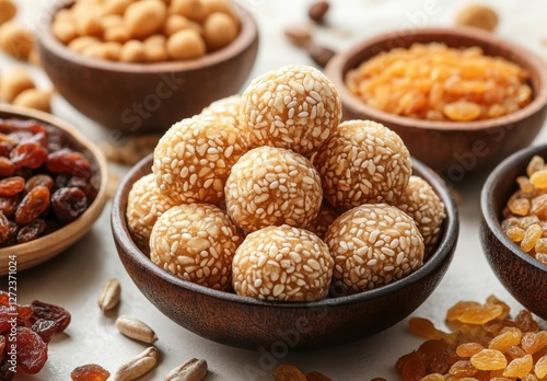 Delicious and Healthy Sesame Balls Surrounded by Various Nuts and Dried Fruits for Nutritious Snack Ideas and Culinary Inspiration