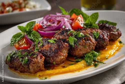 Delicious Arabic meat kabab served with saffron, onions, and fresh tomatoes on a plate