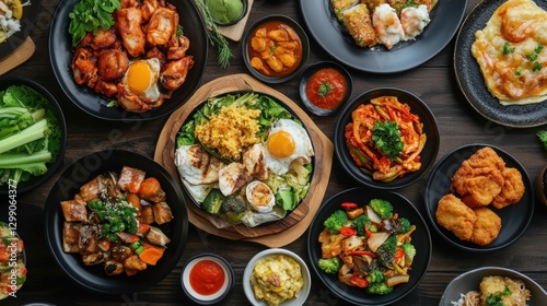 Delicious Assorted Asian Cuisine on Dark Wooden Table