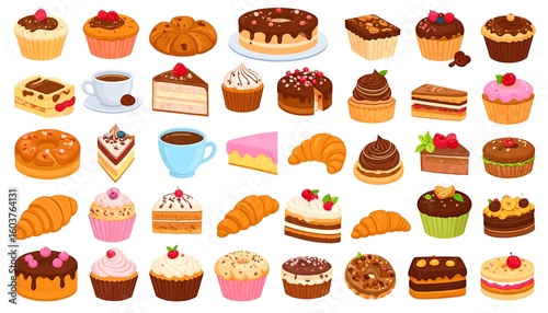 Delicious Assortment of Bakery Treats: An Array of Cakes, Pastries, and Beverages