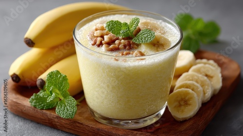 Delicious banana smoothie with walnuts and mint on wooden tray, healthy drink