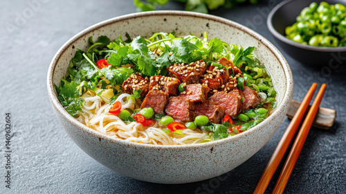 Delicious bowl of pho with tender beef, fresh herbs, and vibrant vegetables