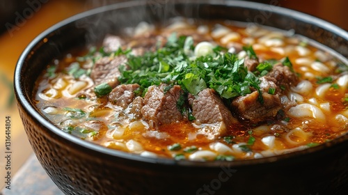 Delicious bowl of steaming noodle soup topped with succulent beef slices and fresh herbs, creating a tempting culinary experience.