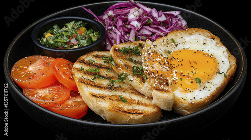 Delicious breakfast plate featuring grilled bread, fried egg, fresh tomatoes, and vibrant salad, perfect for hearty meal