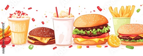 Delicious burgers, french fries, milkshakes and lemon forming a tasty fast food background