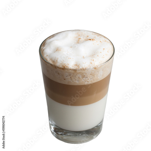 Delicious cappuccino in clear glass cup layers of coffee and foam on soft gray surface