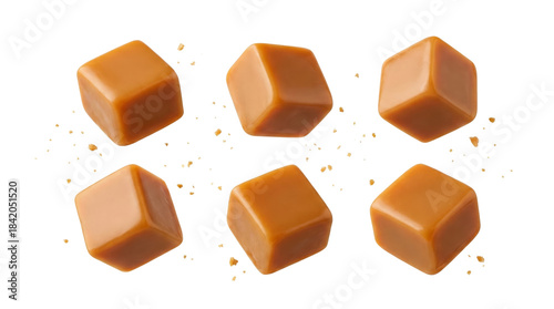Delicious caramel squares tumbling with scattered sugar crystals on a solid colored background