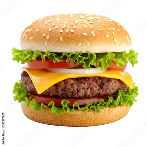 Delicious cheeseburger with lettuce, tomato, and onion. Perfect for food blogs, restaurant menus, advertisements, and social media posts.