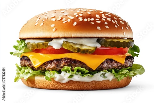 Delicious cheeseburger with lettuce, tomato, and pickles on a soft sesame seed bun