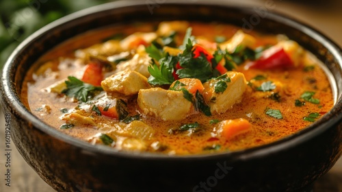Delicious chicken curry in a bowl, garnished with fresh herbs, on a rustic wooden surface. Possible use Food photography for recipe inspiration or restaurant menu